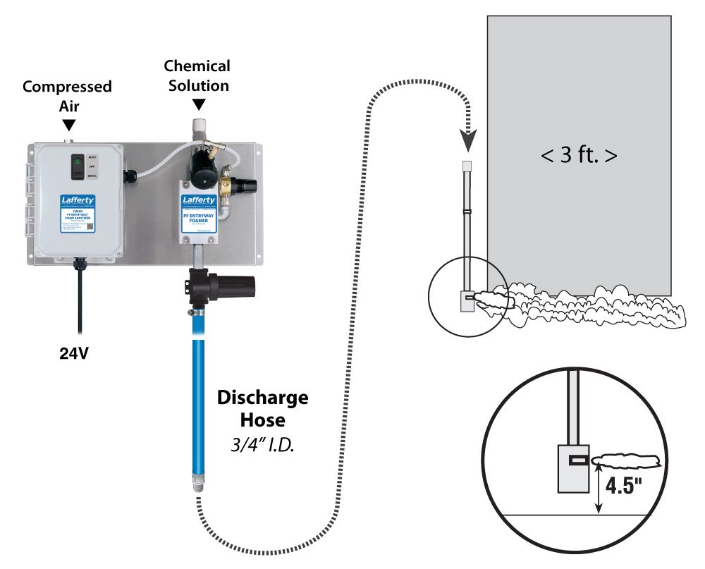 The Timed PF Entryway Foam Sanitizer is an automated foam applicator for projecting sanitizing chemicals on to floors of 3' wide employee walk doors to prevent